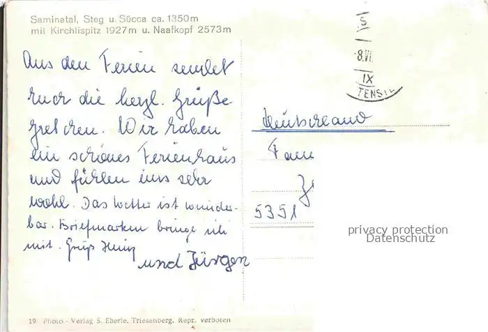 alte Postkarte Saminatal Fuerstentum Liechtenstein mit Steg und Suecca und Kirchlispitz mit Naafkopf postalisch gelaufen Erhaltung siehe scans [WerneD78]