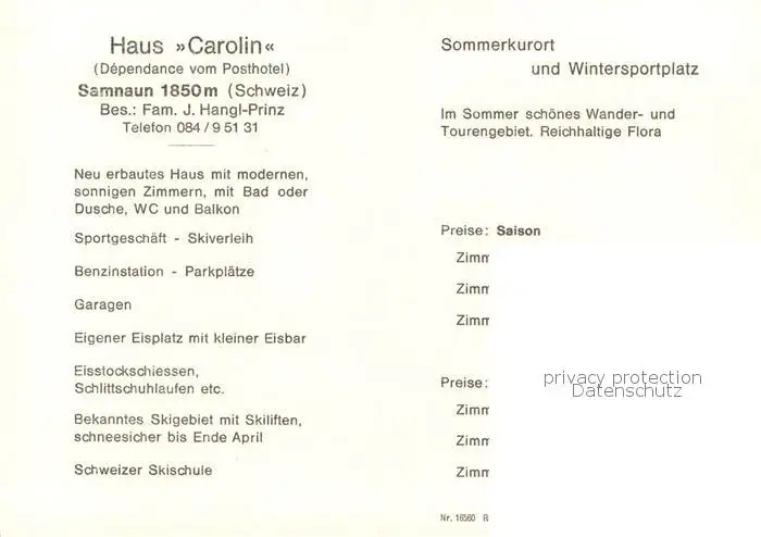 Samnaun_Dorf_GR Haus Carolin Gaestezimmer postalisch nicht gelaufen nach 1965 Werbekarte (keine Postkarte) Erhaltung siehe scans [FriedD77] Werbekarte (keine Postkarte) Frierer