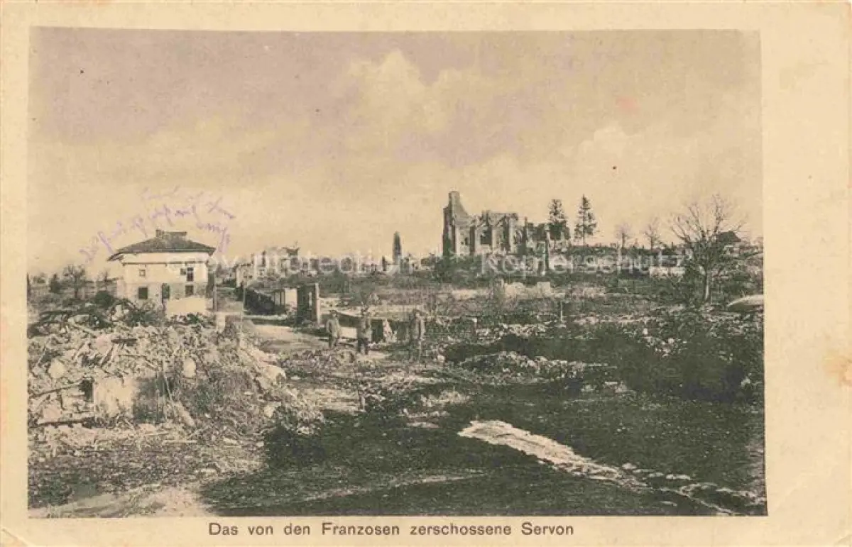 carte postale Servon-Melzicourt Sainte-Menehould 51 Marne Das von den Franzosen zerschossene Dorf Truemmer 1. Weltkrieg postalisch gelaufen Feldpostamt (Stempel) Erhaltung siehe scans [FriedD77]
