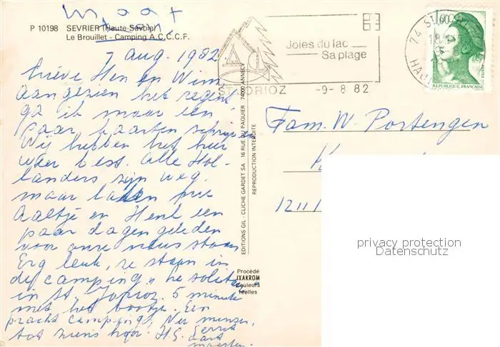 Sevrier_74_Haute-Savoie Le Brouillet Camping vue aérienne postalisch gelaufen 1982 Fliegeraufnahme Erhaltung siehe scans [FriedD77] Fliegeraufnahme Frierer