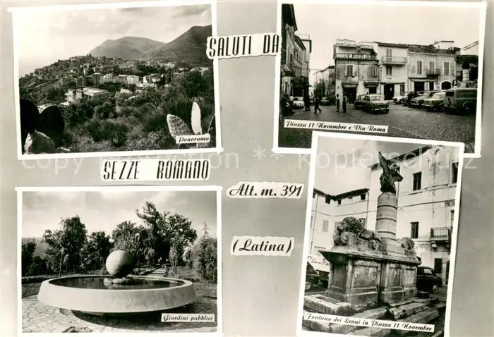 AK / Ansichtskarte Sezze_Latina Panorama Piazza IV November e Via Roma Giardini pubblici Fontana dei Leoni in Piazza IV November Sezze_Latina