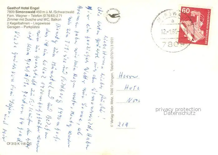 Simonswald_Simonswaeldertal Gasthof Hotel Engel im Schwarzwald postalisch gelaufen 1985 Erhaltung siehe scans [FriedD77] Frierer
