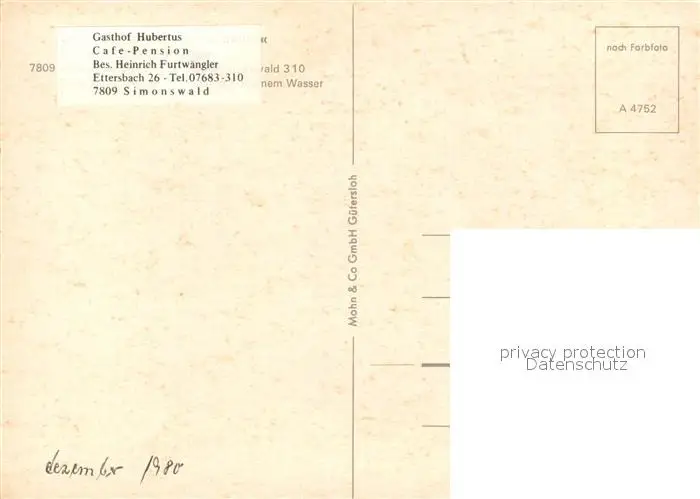 Simonswald_Simonswaeldertal Gasthof Hubertus Gartenterrasse postalisch nicht gelaufen 1980 Erhaltung siehe scans [WerneD78] WernPID7