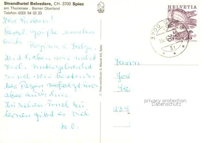 Spiez_BE Strandhotel Belvedere Spiez_BE postalisch gelaufen nach 1965 Erhaltung siehe scans [LiesaD40] LiesID40