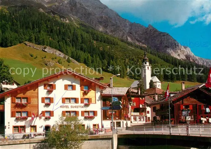 AK / Ansichtskarte Spluegen_GR Hotel Suretta Kirche am Spluegenpass Alpenpass Spluegen_GR