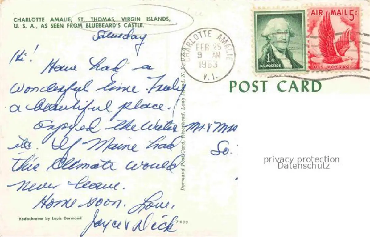 old postcard St Thomas Virgin Islands USA Charlotte Amalie as seen from Bluebeard's Castle postalisch gelaufen Erhaltung siehe scans [FriedD77]