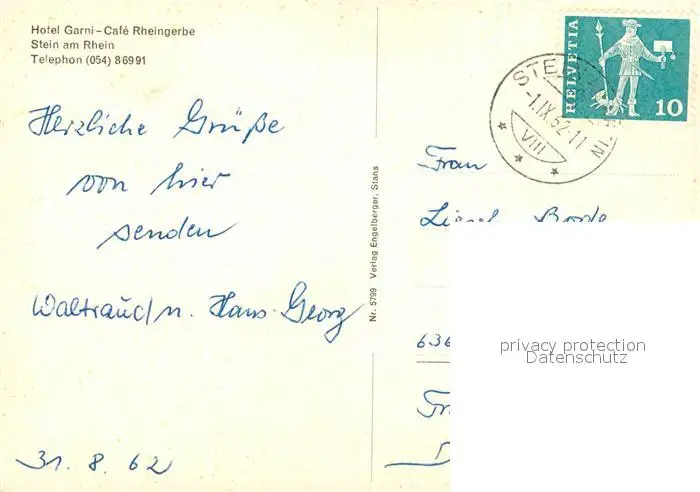 Stein_Rhein Hotel Garni Cafe Rheingerbe Stein Rhein postalisch gelaufen 1962 Erhaltung siehe scans [NatalD47] NataID47