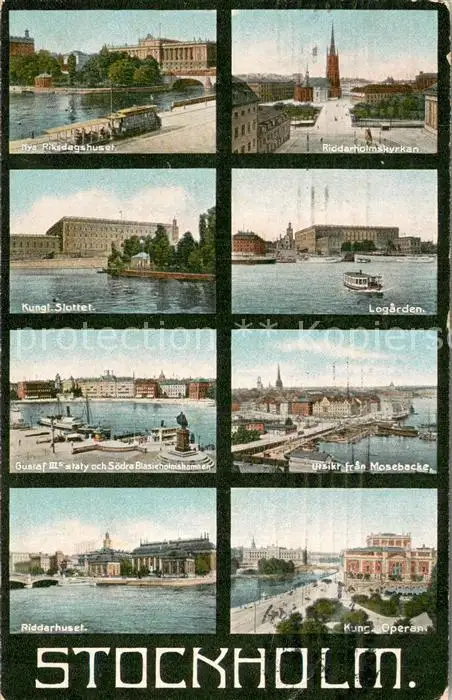 Stockholm Riksdagshuset Ridderholmskyrkan Kungl Slottet Logarden Utsikt fran Mosebacke Kungl Operan Stockholm postalisch nicht gelaufen 1921-1965 Erhaltung siehe scans [WerneD78] WernPID7