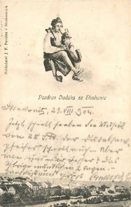 Strakonice_Strakonitz Gesamtansicht Musikant mit Tier Strakonice_Strakonitz postalisch gelaufen 1904 Erhaltung siehe scans [FriedD77] Frierer