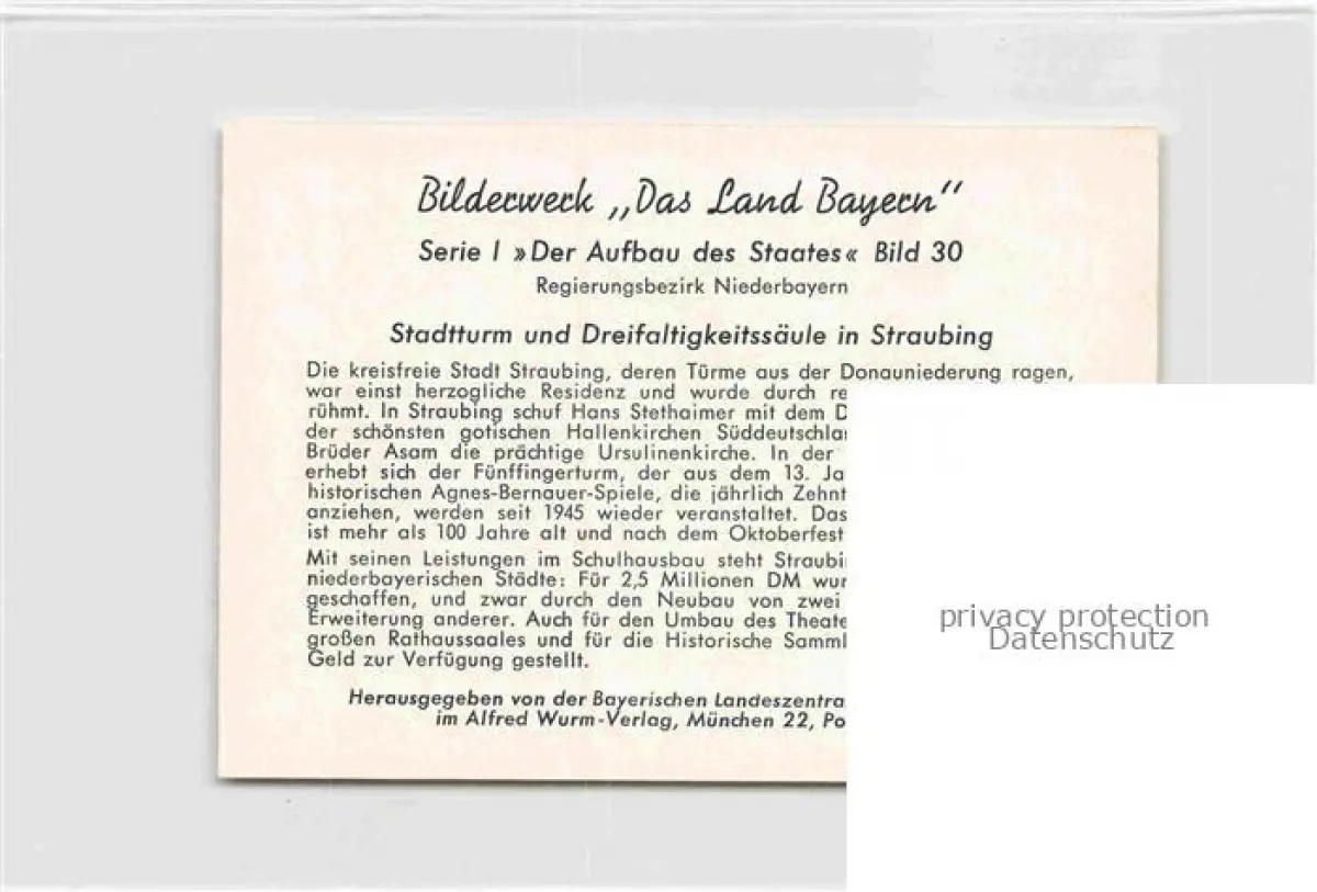 Straubing Stadtturm und Dreifaltigkeitssaeule postalisch nicht gelaufen Werbekarte (keine Postkarte) Erhaltung siehe scans [WerneD78] Werbekarte (keine Postkarte) Wern Katcode 11110009263000