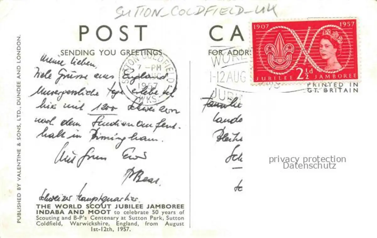 14091870 Sutton Coldfield Birmingham UK The World Scout Jubilee Jamboree 1957 celebrating 50 years of Scouting and B-P's Centenary at Sutton Park postalisch gelaufen Erhaltung siehe scans [FriedD77] old postcard Frie Katcode 11570UKG3G31CN
