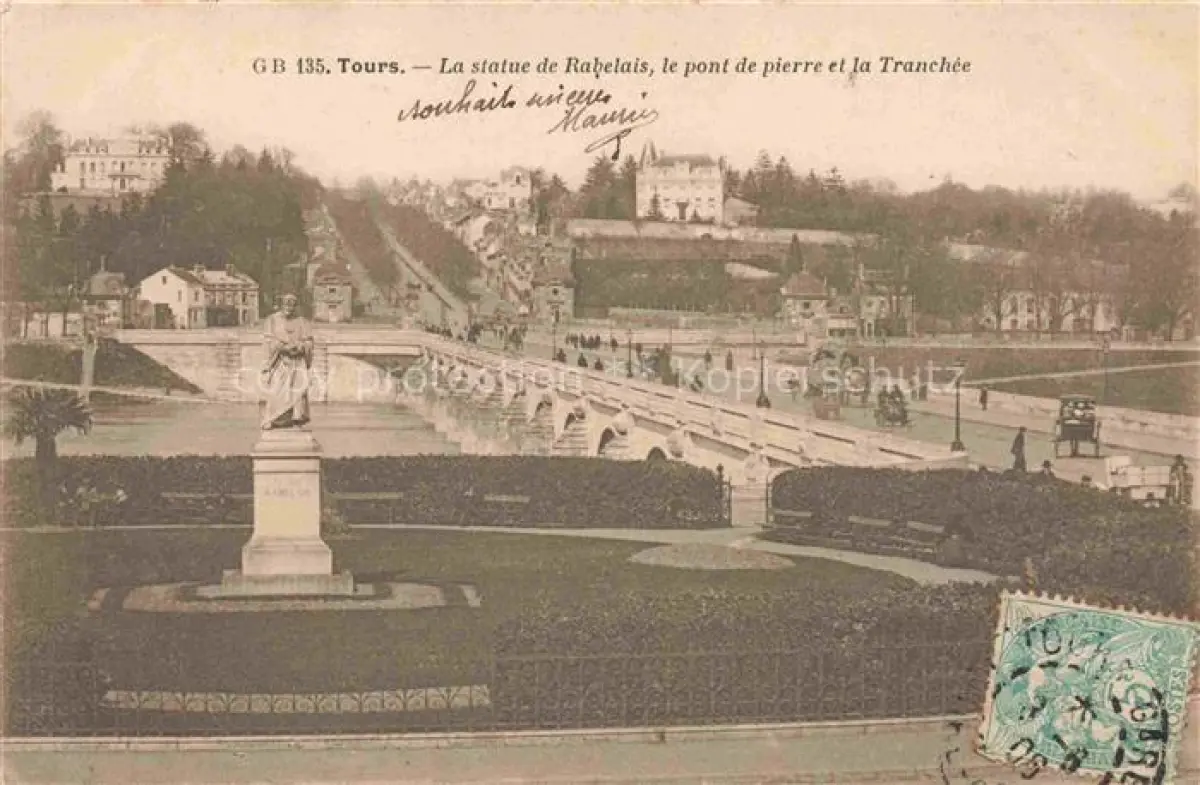 14116580 TOURS 37 Indre-et-Loire La statue de Rabelais le pont de pierre et la Tranchee postalisch gelaufen Erhaltung siehe scans [WerneD78] carte postale Wern Katcode 11170037237261