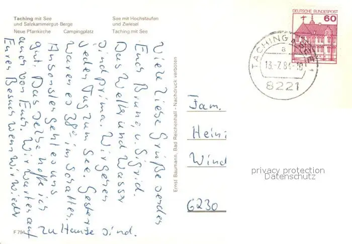 Taching_See Panorama Alpen Pfarrkirche Campingplatz Viehweide Kuehe Taching See postalisch gelaufen 1984 Erhaltung siehe scans [FriedD77] Frierer