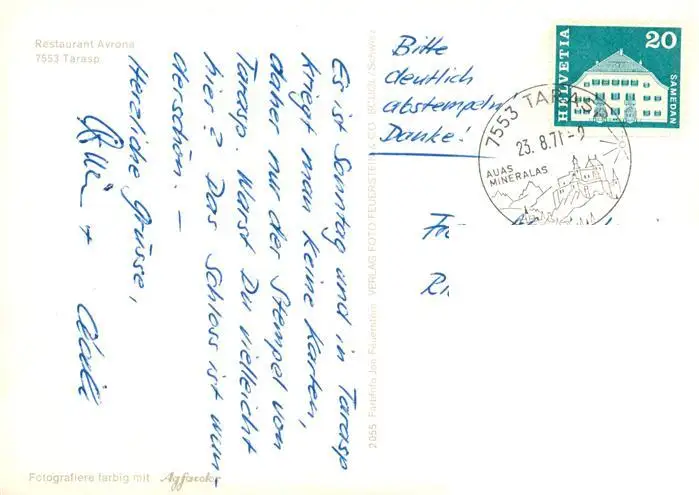 Tarasp Restaurant Avrona Tarasp postalisch gelaufen 1971 Erhaltung siehe scans [FriedD77] Frierer