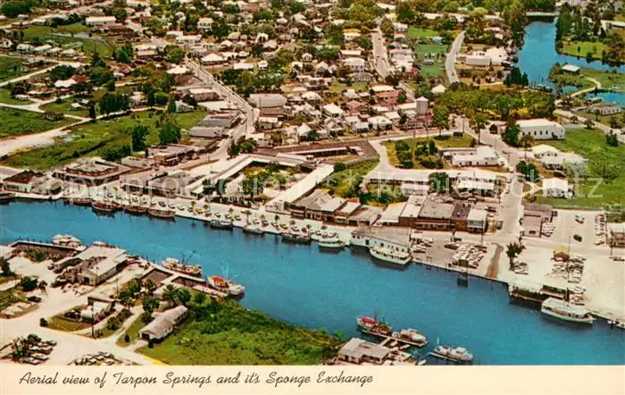 AK / Ansichtskarte Tarpon_Springs Aerial view Sponge Exchange showing Sponge Boats docked in Anclote River