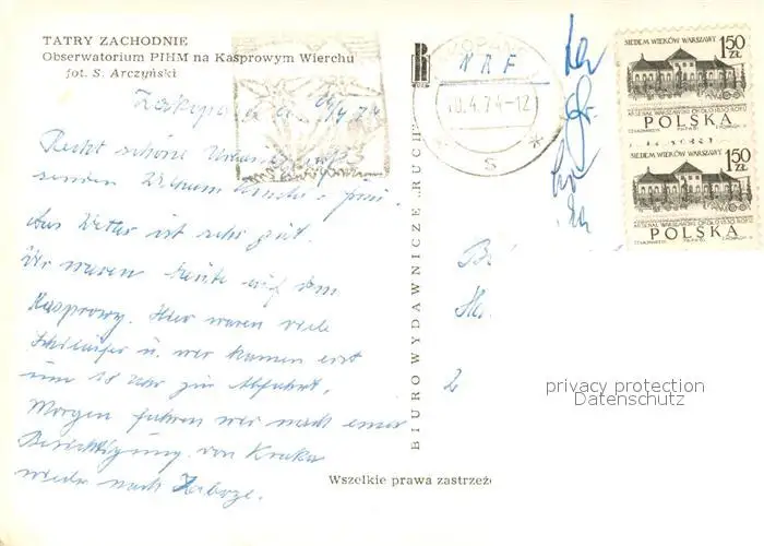 Tatry_Zachodnie Obserwatorium PIHM na Kasprowym Wierchu Tatry Zachodnie postalisch gelaufen 1974 Erhaltung siehe scans [WerneD78] WernPID7
