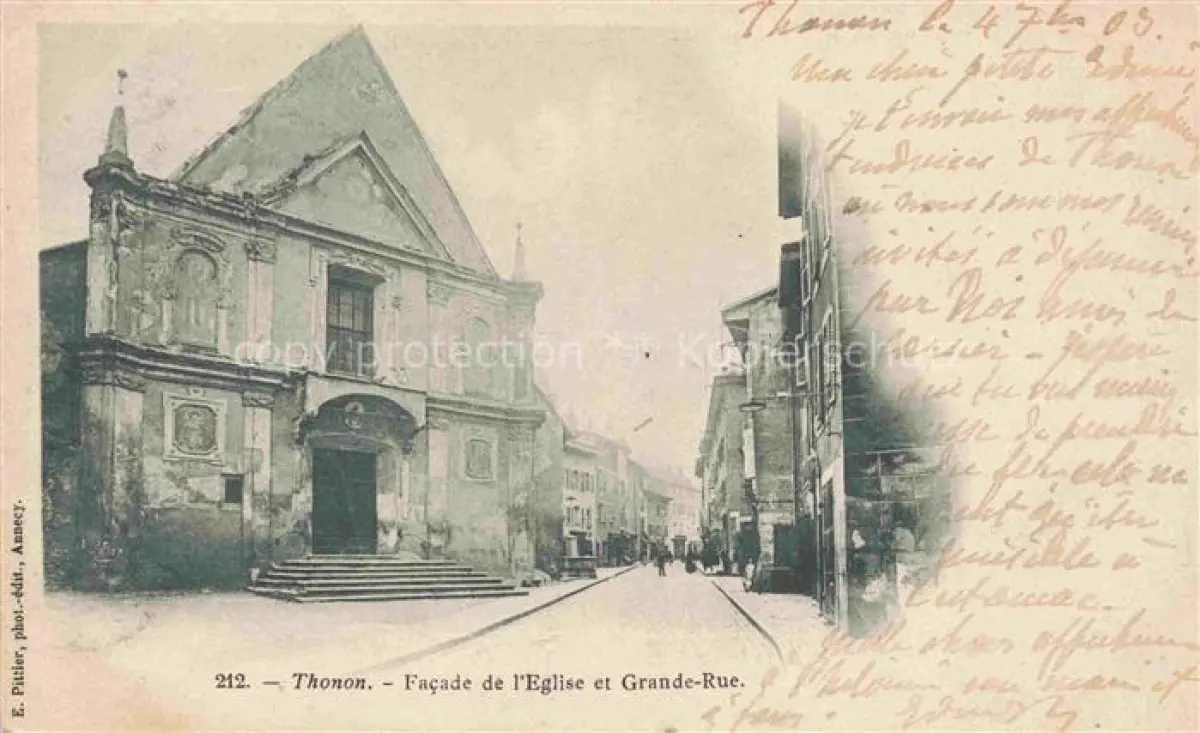 14109138 Thonon-les-Bains 74 Haute-Savoie Facade de l'église et Grande Rue postalisch gelaufen Erhaltung siehe scans [FriedD77] alte Postkarte Frie Katcode 11170074474281