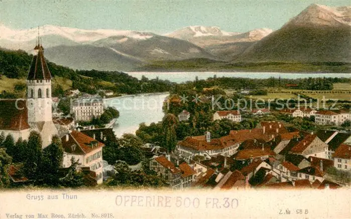 Thun_BE Ortsansicht mit Kirche Thunersee Alpen Thun_BE postalisch gelaufen 1902 Erhaltung siehe scans [FriedD77] Frierer