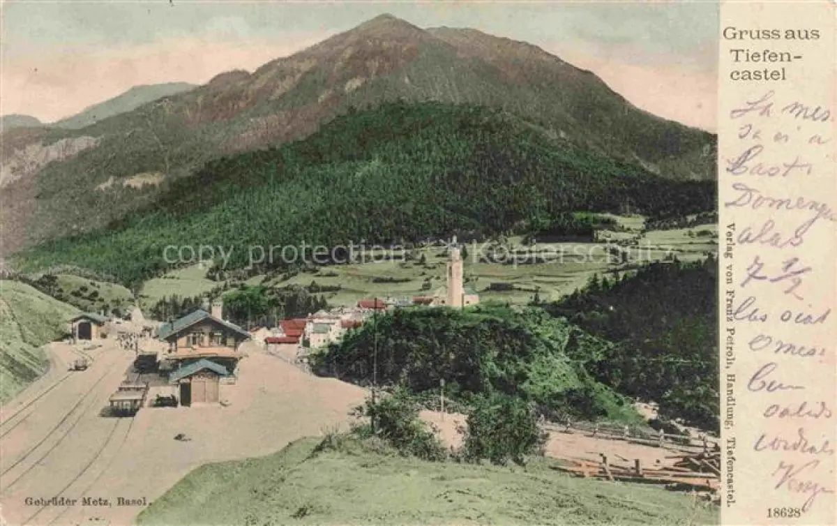 14102444 Tiefencastel GR Panorama Bahnhof Ortsansicht mit Kirche postalisch gelaufen Erhaltung siehe scans [FriedD77] alte Postkarte Frie Katcode 11470100305976