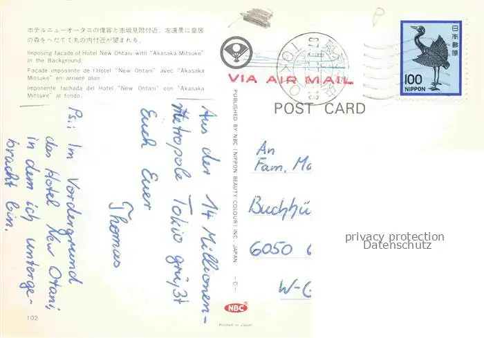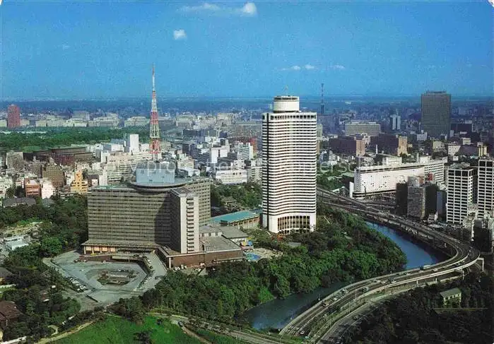 14060554 Tokyo TOKIO Japan Hotel New Ohtani with Akasaka Mitsuke in the background aerial view postalisch gelaufen Fliegeraufnahme Erhaltung siehe scans [FriedD77] Fliegeraufnahme old postcard Frie Katcode 12050