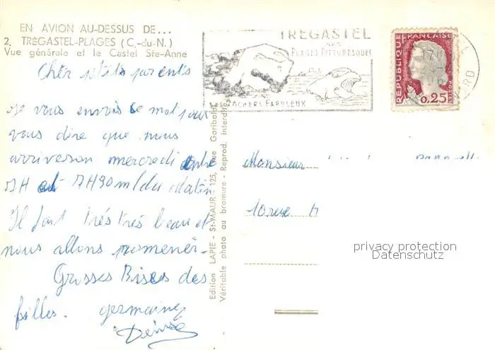 Tregastel Vue générale et Castel Sainte Anne vue aérienne Tregastel postalisch gelaufen ca. 1960 Erhaltung siehe scans [FriedD77] Frierer