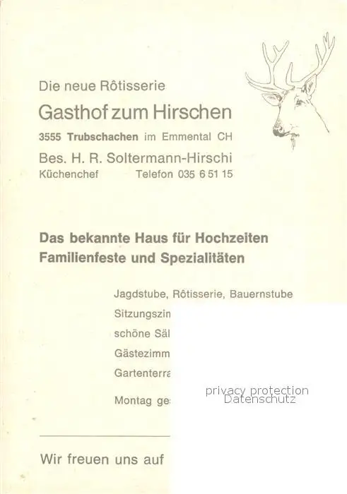 Trubschachen Gasthof zum Hirschen Trubschachen postalisch nicht gelaufen nach 1965 Werbekarte (keine Postkarte) Erhaltung siehe scans [KathaD81] Werbekarte (keine Postkarte) Kathoren