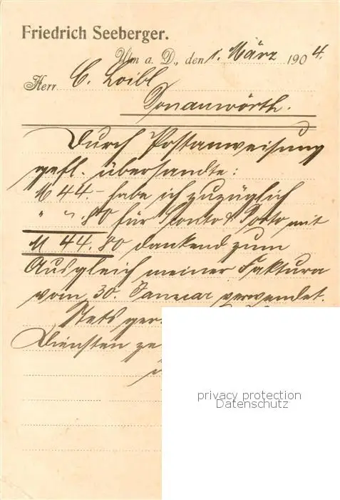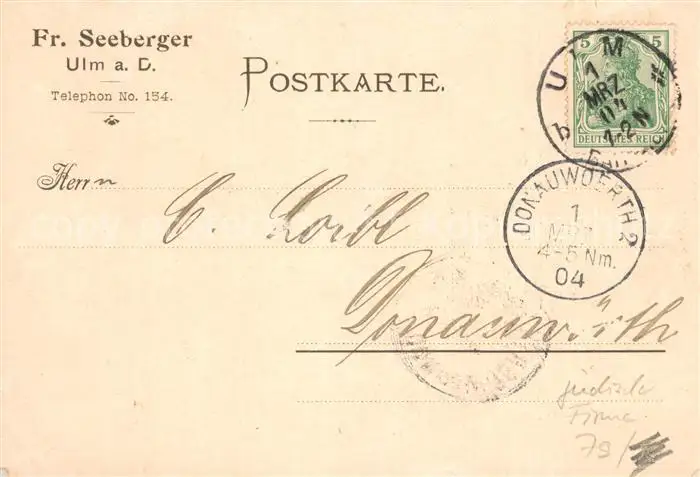 Ulm__Donau Friedrich Seeberger Antwortkarte postalisch gelaufen 1904 Erhaltung siehe scans [WerneD78] WernPID7