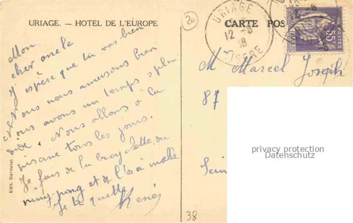 14116988 Uriage-les-Bains GRENOBLE 38 Isere Hotel de l'Europe postalisch gelaufen Erhaltung siehe scans [WerneD78] carte postale Wern Katcode 11170038138529