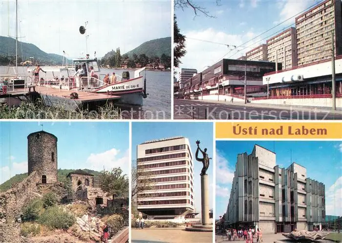 Usti_nad_Labem Stadtansichten Bootsanleger Gebaeude Hotel Hochhaus Burgruine Usti_nad_Labem postalisch gelaufen 1990 Erhaltung siehe scans [FriedD77] Frierer