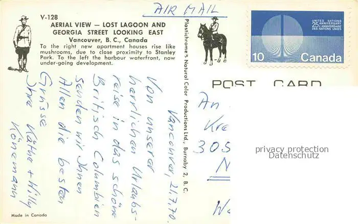 old postcard VANCOUVER BC Canada Aerial view Lost Lagoon and Georgia Street postalisch gelaufen Erhaltung siehe scans [WerneD78]
