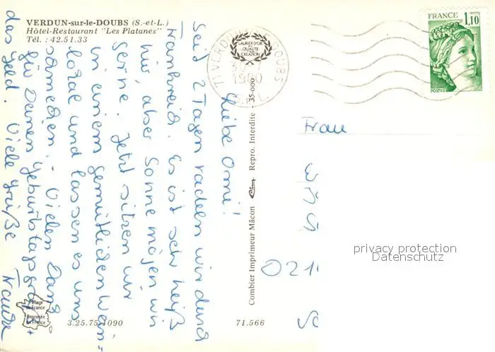 Verdun-sur-le-Doubs Hotel Restaurant Les Platanes Verdun-sur-le-Doubs postalisch gelaufen 1980 Erhaltung siehe scans [KathaD81] Kathoren