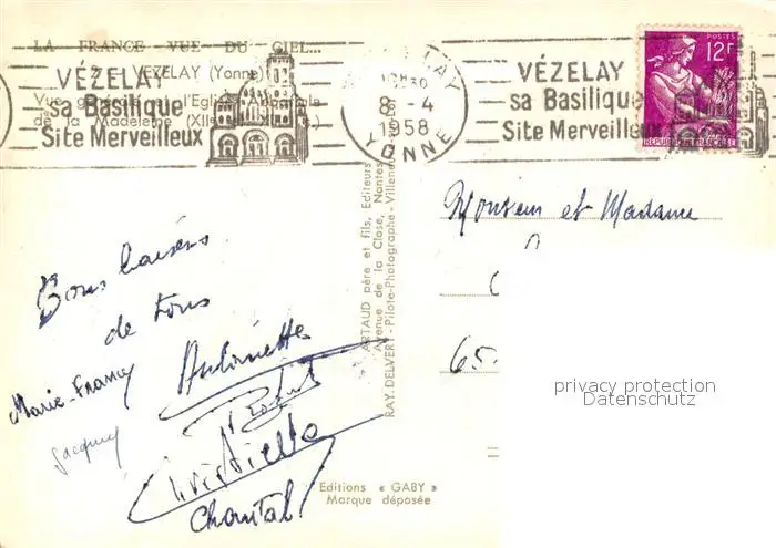 Vezelay Eglise Abbatiale de la Madeleine XIIe siècle vue aérienne Vezelay postalisch gelaufen 1958 Erhaltung siehe scans [FriedD77] Frierer