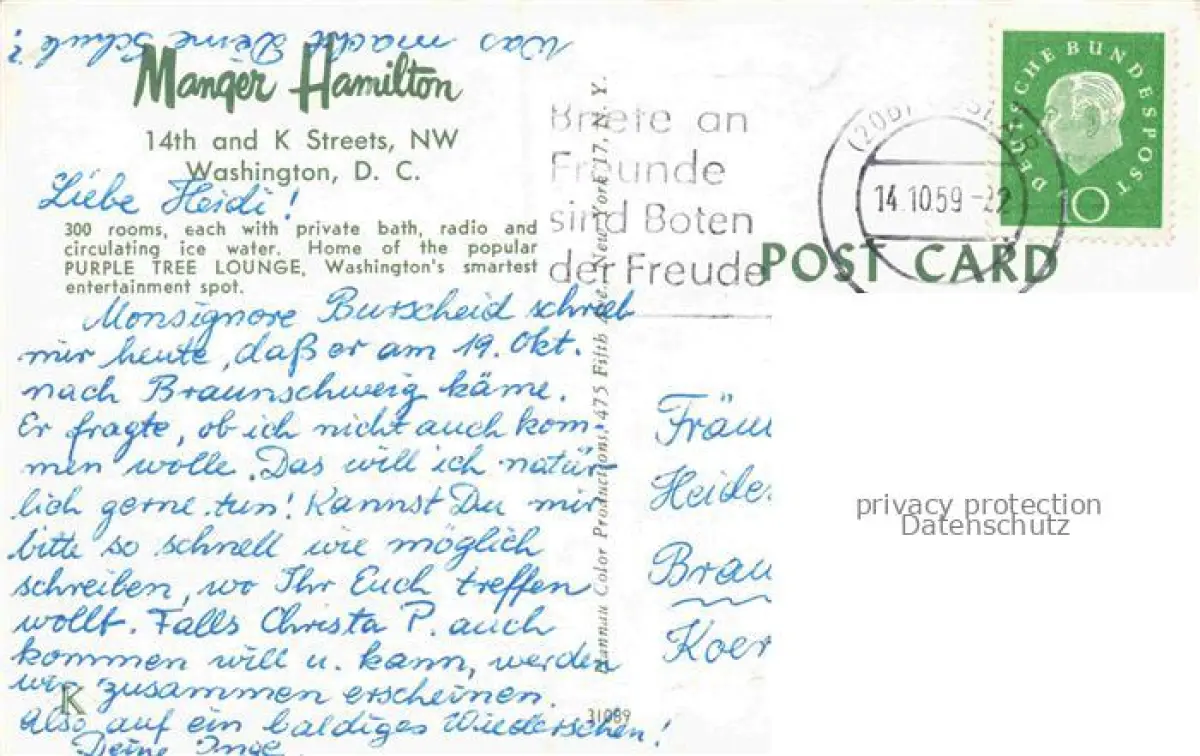 old postcard WASHINGTON DC USA Manger Hamilton postalisch gelaufen Erhaltung siehe scans [WerneD78]