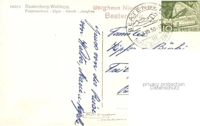 Waldegg_Beatenberg mit Finsteraarhorn Eiger Moench und Jungfrau Waldegg Beatenberg postalisch gelaufen 1950 Erhaltung siehe scans [FriedD77] Frierer