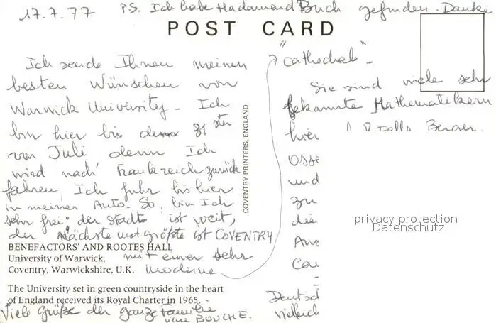 Warwick Benefactors and Rootes Hall University of Warwick postalisch nicht gelaufen 1977 Erhaltung siehe scans [WerneD78] WernPID7