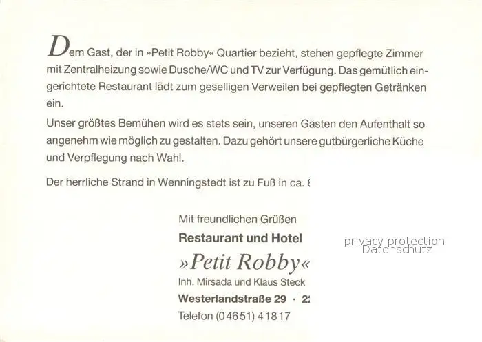 Wenningstedt_Sylt Restaurant Hotel Petit Robby Wenningstedt_Sylt postalisch nicht gelaufen nach 1965 Werbekarte (keine Postkarte) Erhaltung siehe scans [FriedD77] Werbekarte (keine Postkarte) Frierer