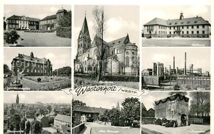 AK / Ansichtskarte Westerholt_Westfalen Pfarrkirche Zeche Ehrenmal Alter Torbogen Totalansicht Schloss Westerholt_Westfalen