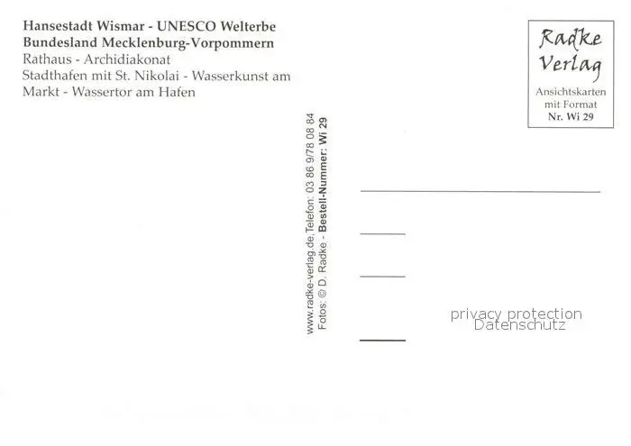 Wismar_Mecklenburg Rathaus Archidiakonat Stadthafen St Nikolai Kirche Wasserkunst Markt Wassertor Moewe Wismar_Mecklenburg postalisch nicht gelaufen nach 1965 Erhaltung siehe scans [FriedD77] Frierer