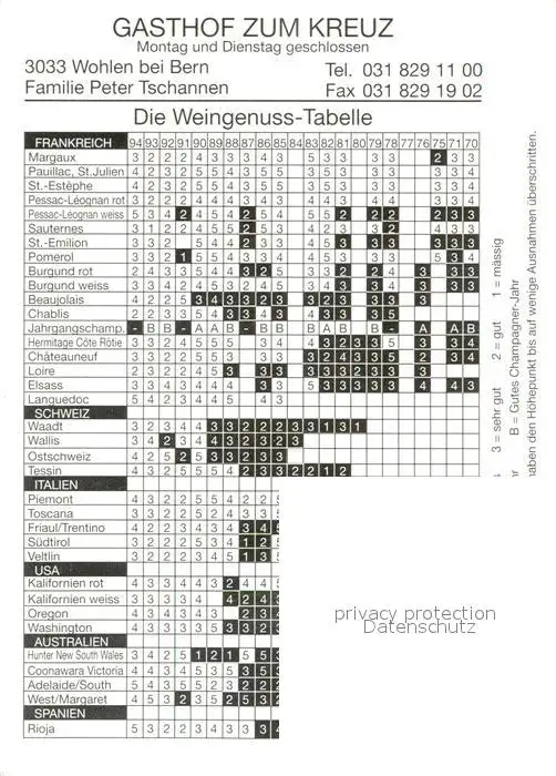 Wohlen_BE Gasthof zum Kreuz Weingenuss Tabelle Wohlen_BE postalisch nicht gelaufen nach 1965 Keine Postkarte (siehe scan) Erhaltung siehe scans [FriedD77] Keine Postkarte (siehe scan) Frierer
