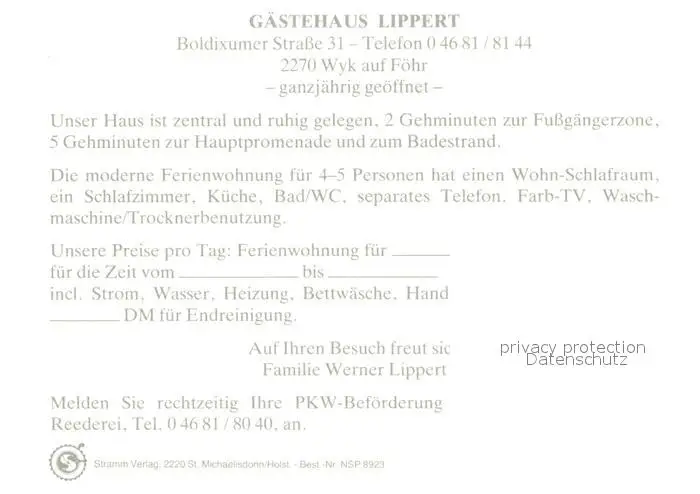 Wyk_Foehr Gaestehaus Lippert Informationen Foehr postalisch nicht gelaufen nach 1965 Werbekarte (keine Postkarte) Erhaltung siehe scans [LiesaD40] Werbekarte (keine Postkarte) LiesID40