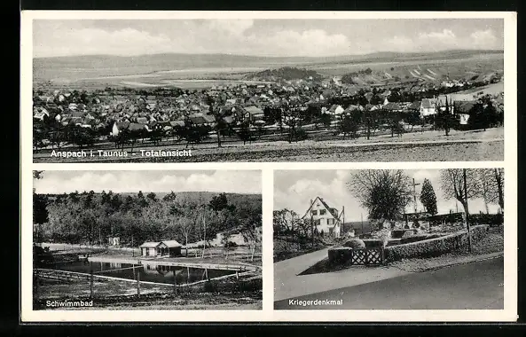 AK Anspach i. Taunus, Kriegerdenkmal, Schwimmbad & Totalansicht
