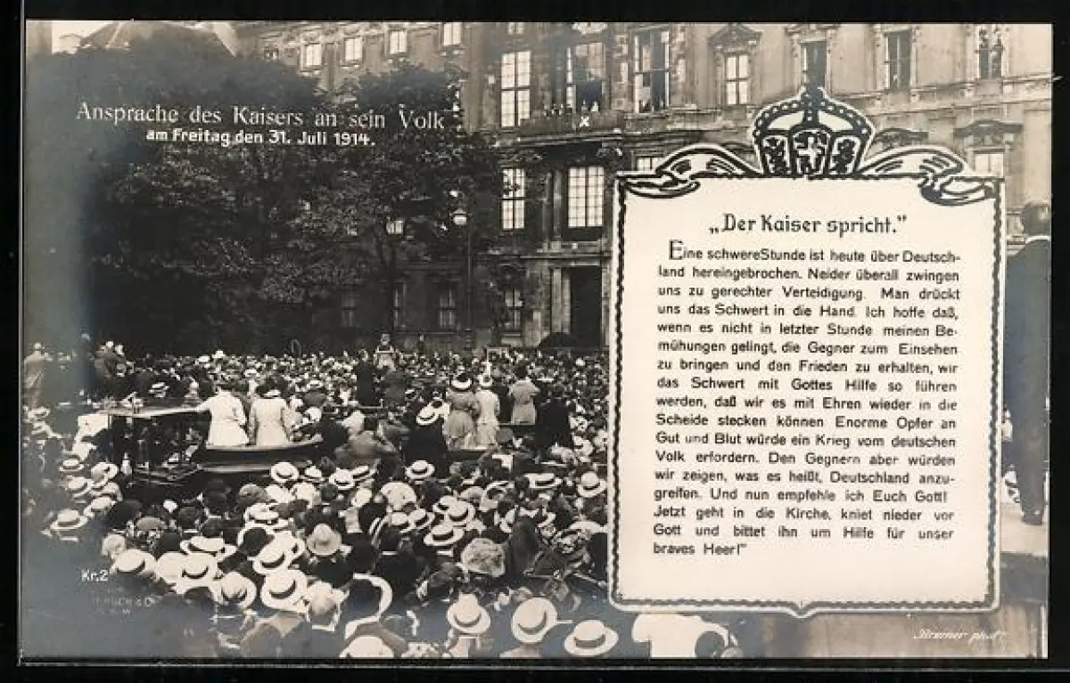 AK Ansprache des Kaisers an sein Volk 1914, Der Kaiser spricht, Eine schwere Stunde ist heute über Deutschland herein...