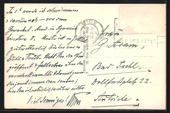 Personenbezogene Daten auf der Rückseite der Karte wurden durch blauen Textmarker unkenntlich gemacht. Die blauen Stellen sind auf die Vorderseite durchgeweicht und wirken sich negativ auf das Postkartenfoto aus