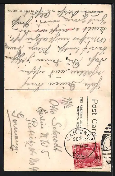 Personenbezogene Daten auf der Rückseite der Karte wurden durch blauen Textmarker unkenntlich gemacht. Die blauen Stellen sind auf die Vorderseite durchgeweicht und wirken sich negativ auf das Postkartenfoto aus