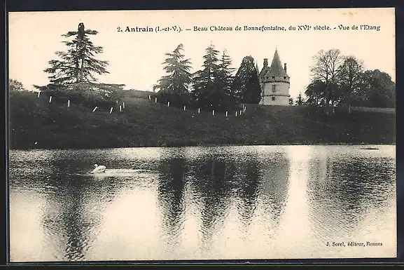AK Antrain, Beau Château de Bonnefontaine du XVIe siècle, Vue de l`étang