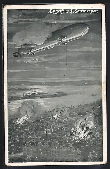AK Antwerpen, Luftschiff beim Angriff auf die Stadt