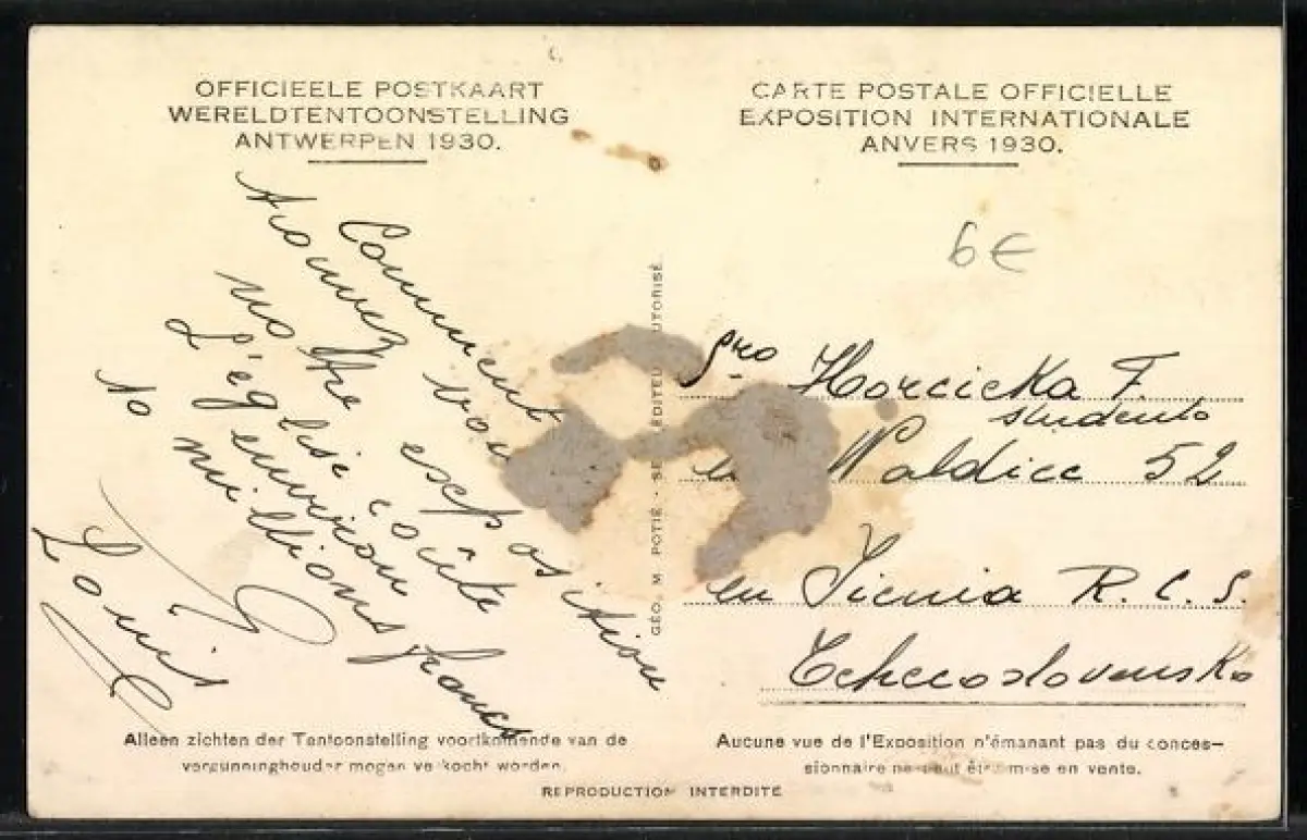Personenbezogene Daten auf der Rückseite der Karte wurden durch blauen Textmarker unkenntlich gemacht. Die blauen Stellen sind auf die Vorderseite durchgeweicht und wirken sich negativ auf das Postkartenfoto aus