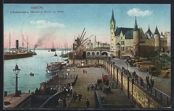AK Anvers, L`Embarcadère, l`Escaut et Musée du Steen