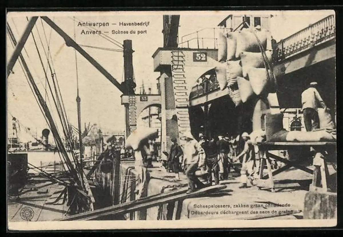 AK Anvers, Scènes du port, Débardeurs déchargeant des sacs de grains