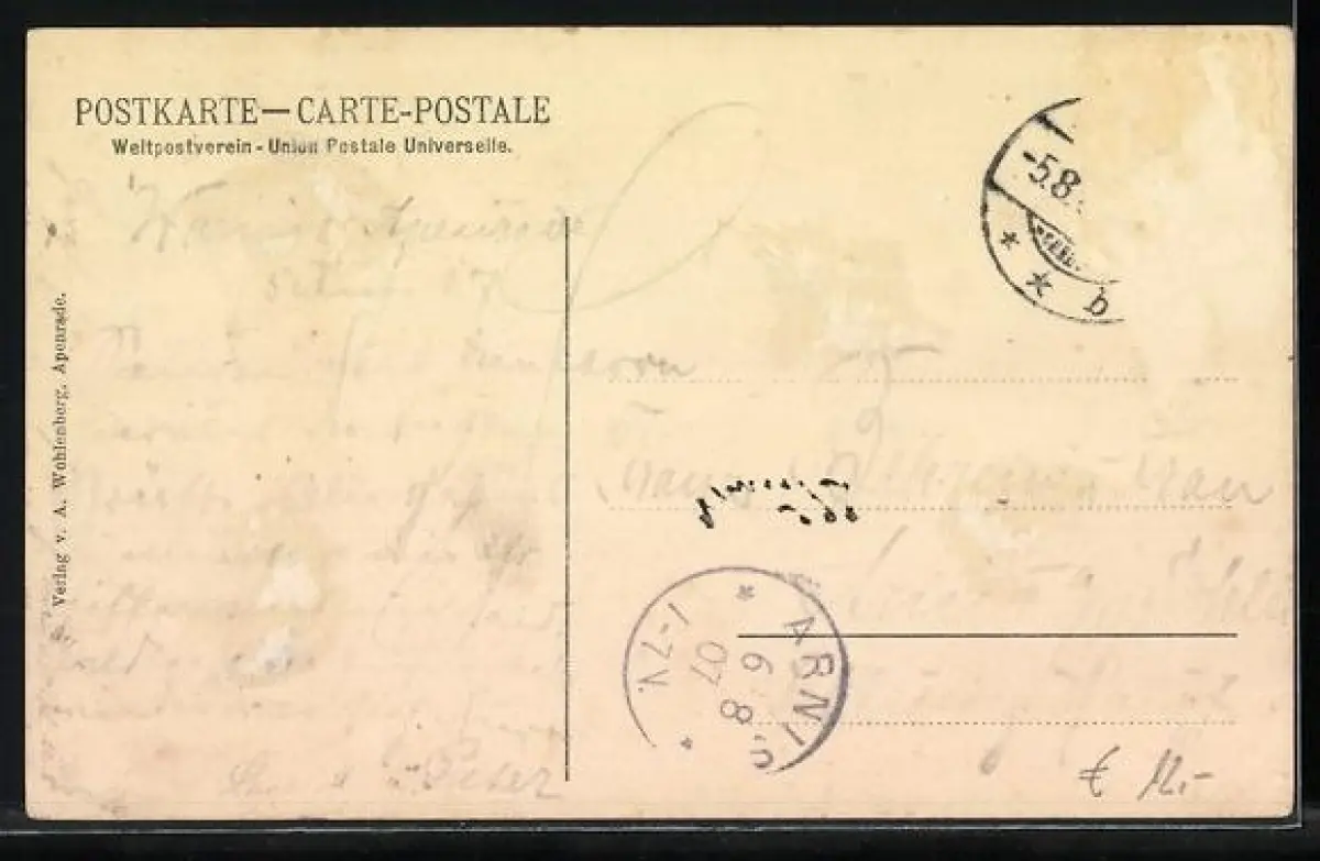 alte Ansichtskarte, gelaufen 1907, Briefmarke entfernt, rückseitig Oberflächenschaden, guter Zustand